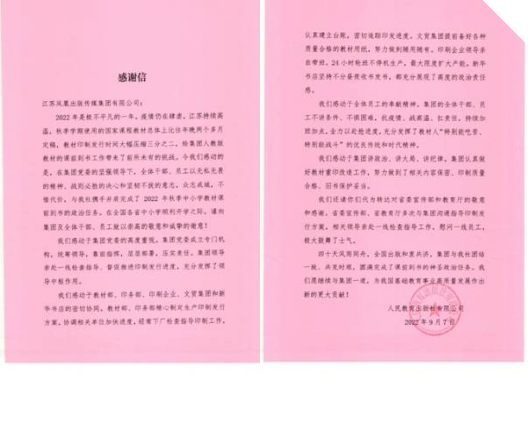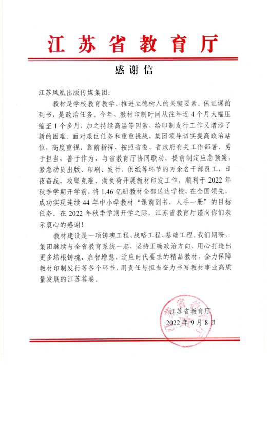 9月7日,江苏省教育厅、人民教育出版社专门向集团发来感谢信,向集团及全体干部、员工致以崇高的敬意和诚挚的谢意!2022 年秋季“课前到书”是覆盖全国的攻坚战,我省的秋季教材出版印制发行率先圆满落幕。集团将继续与全省教育系统一起,坚持正确政治方向,用心打造出更多培根铸魂、启智增慧、适应时代要求的精品教材,切实履行教材政府采购中标承诺,全力保障“课前到书”政治任务的圆满收官,以实际行动迎接党的二十大胜利召开!
