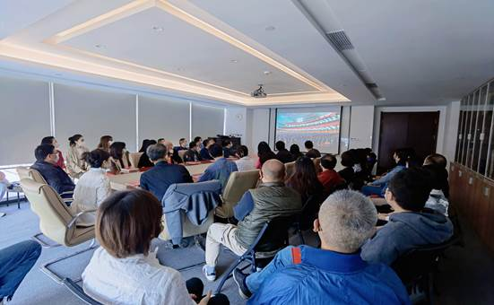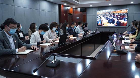 教育发展公司组织本部全体员工齐聚会议室集中收看开幕会直播。