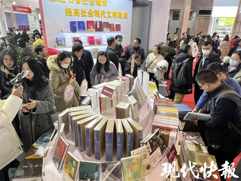 1月11日开幕当天开展前,中国国际展览中心门口,进展人群已经排起长长的队伍。进入主场馆,到处人潮涌动,各场馆内随处可见认真翻阅图书的读者。步入江苏出版展厅,首先映入眼帘的便是“苏版精品”展台,展陈着列入2022年中宣部主题出版重点出版物的“国家文化公园画传系列” 丛书、茅盾文学奖获奖及提名作品《本巴》《有生》、鲁迅文学奖获奖作品《诗歌植物学》《奇迹》、曾获“中国好书”的《敦煌岁时节令》《蹦极》等众多凤凰版好书。