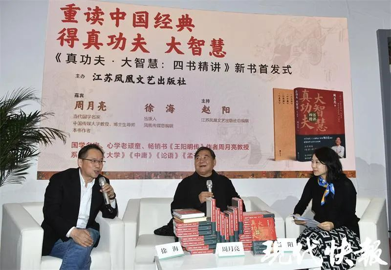 除了精品好书,凤凰集团旗下各大出版社举行的阅读推广活动也引得读者驻足。1月11日上午,当代国学名家、中国传媒大学阳明学院院长周月亮携新书《真功夫,大智慧:四书精讲》与凤凰传媒总编辑徐海展开对话,畅谈如何在经典中寻找当今生活的答案。苏科版科普图书一直位居全国科普出版细分市场前列,苏科社在2023年推出的“青鸟新知”文库第一批六本图书也在本次图书订货会上亮相。六本图书的作者均是我国野生动物与自然保护领域的中坚力量,他们分享了各自在野生动植物保护工作方面的经历和趣事。在儿童文学领域,深受孩子们喜爱的儿童文学作家谷清平、赵菱也分别带着新作与读者见面。