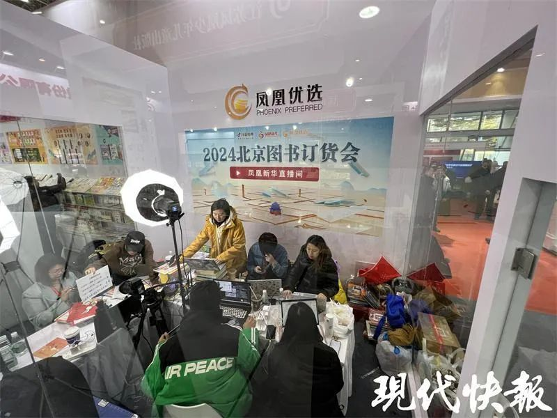 在江苏出版展厅的一角,两间凤凰电商优选直播间格外引人注意。透明的玻璃房内,几架补光灯照亮了主播的脸庞,主播正举着一块白板在镜头前直播,白板上标注着不同的购书链接,适合不同年龄段的儿童,一旁的助播则有条不紊地展示着书籍。