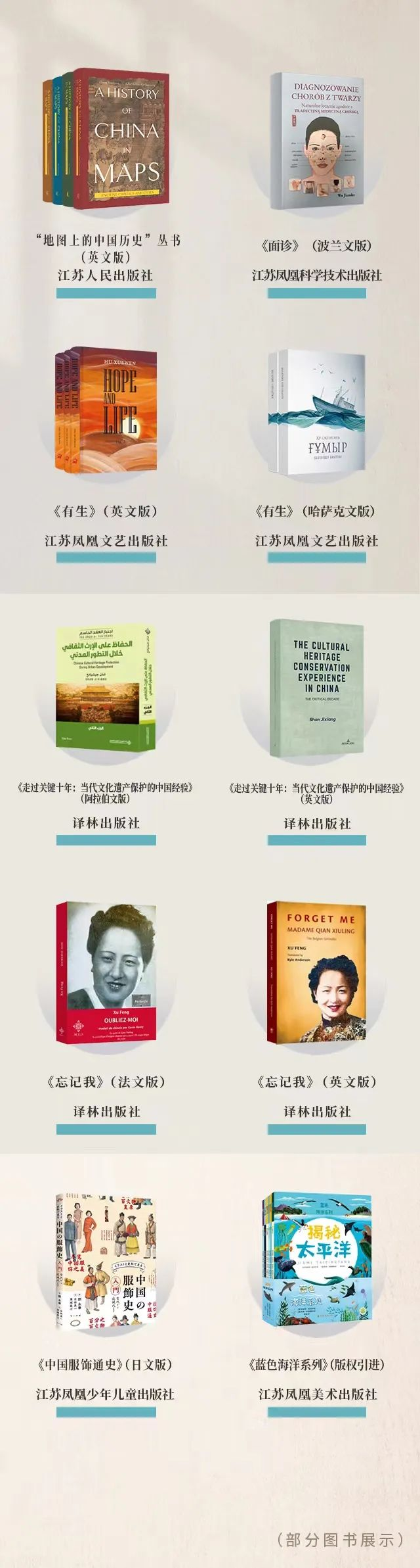苏人社“地图上的中国历史”丛书(英文版);苏科社《面诊》(波兰文版);苏少社《中国服饰通史》(日文版);文艺社《有生》(英文版、哈萨克文版);译林社《忘记我》(英文版、法文版)《走过关键十年:当代文化遗产保护的中国经验》(阿拉伯文版、英文版);求真译林《习近平新时代中国特色社会主义思想学习问答》(英文版、俄文版)等7种图书11个文版入选“第23届输出版优秀图书”。