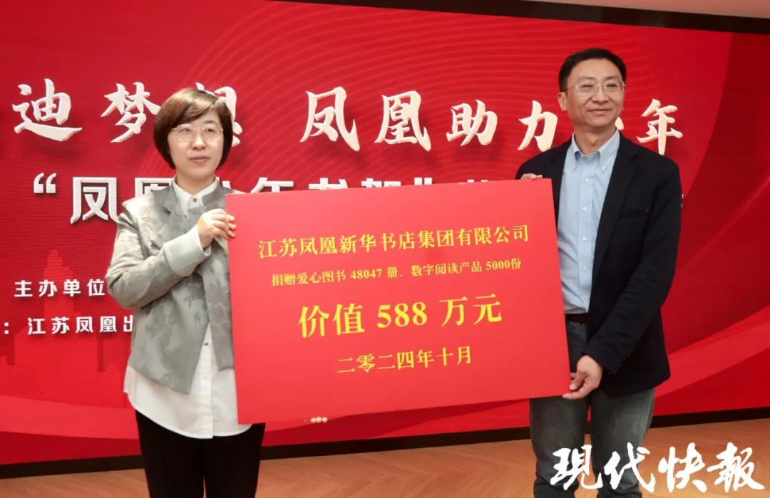 当天,会上举行了2024年“凤凰少年书架”公益关爱项目捐赠仪式。江苏凤凰新华书店集团有限公司向江苏省青基会捐赠爱心图书48047册、数字产品5000份,价值588万元。
