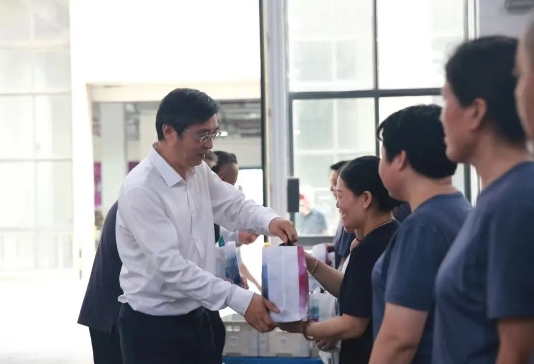 随后,集团领导来到发行集团物流基地,前往物流仓库看望并慰问一线工作人员。开放式仓库内暑气蒸腾,物流一线职工们战高温、赶进度,汗水湿透了工作服,全力保障新学期用书及各类出版物及时送达。“大家辛苦了!一定要注意身体,加强安全生产,做好防暑降温……”每到一处,集团领导为一线职工送上“送清凉”慰问品,向大家在高温下坚守一线表示感谢,激励大家为完成“课前到书”任务作出贡献。在慰问过程中,章朝阳指出,“课前到书、人手一册” 这是一项重要的政治任务,必须不折不扣地圆满完成。安全生产是不可触碰的底线,必须将发展与安全统筹兼顾,以最严格的标准防范各类安全事故,确保万无一失。职工的身体健康是开展一切工作的根本前提,必须以科学严谨的态度做好调度安排,凝聚起推动企业高质量发展的强大合力,确保各项工作稳步推进。