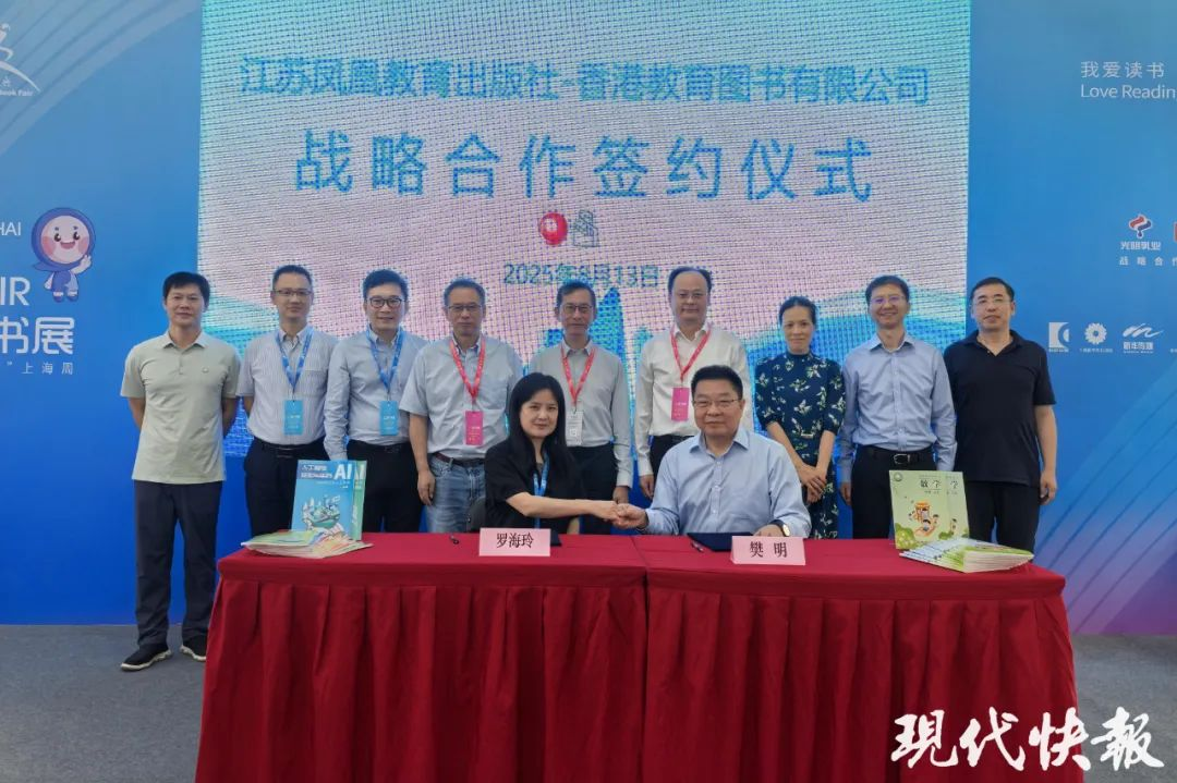 13日早晨,在上海展览中心主展场,凤凰集团首场重点活动——江苏凤凰教育出版社与香港教育图书有限公司战略合作签约仪式举行。凤凰出版传媒集团总经理李贞强、凤凰传媒总编辑徐海、凤凰传媒副总经理袁楠、江苏凤凰教育出版社社长樊明、香港联合出版集团副总裁李家驹、香港教育图书有限公司总编辑罗海玲等出席签约仪式,仪式由江苏凤凰教育出版社总编辑孙兴春主持。