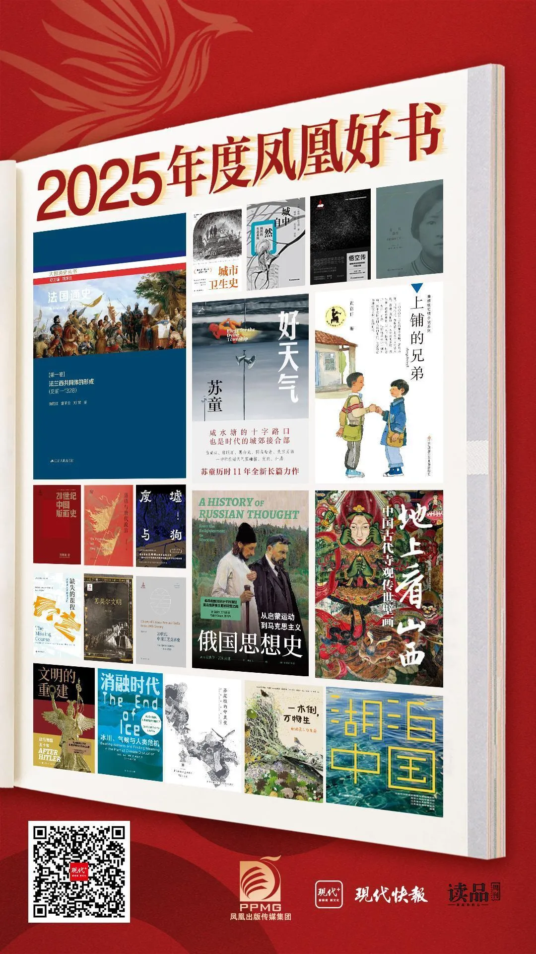 最终入选2025年度“凤凰好书”的20种图书是:《法国通史》(全六卷)《城市卫生史》《城中自然:偶然的生态系统》《悟空传:暗物质空间探索的中国方案》《重识徽音:林徽因建筑笔记》《湖泊中国》《缺失的课程——大学里从未教授过的》《上铺的兄弟》《20世纪中国工艺美术史》《地上看山西:中国古代寺观传世壁画》《20世纪中国版画史》《藩镇与唐代政治》《废墟与狗》《好天气》《苏美尔文明》《俄国思想史:从启蒙运动到马克思主义》《文明的重建:战后德国五十年》《消融时代:冰川、气候与人类危机》《芬尼根的守灵夜》《一木倒,万物生:树的第二次生命》。