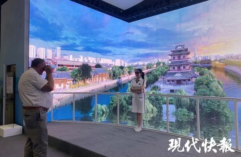 互动屏幕不算大,科技含量却非常高。工作人员介绍,他们是通过在大运河江苏段沿岸部署的 8K 超高清VR全景摄像头,运用江苏移动 5G 信号,以几乎零延时的速度,将无锡清名桥畔的小桥流水人家,以720°全方位实时的方式传输到了现场。