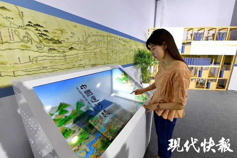 旁边的透明屏触摸展示柜上,还运用科技手段电子化呈现《中国运河志》,也十分吸睛。巍巍青山隐隐若现,一条运河穿流其间。手指在透明屏上轻轻划过,就可以看到散落全球、鲜为人知的运河古图,寻找运河两岸那一个个散落着的古城古镇。