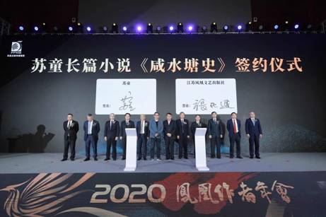 此外,6个重大项目落户凤凰,年会现场举行了“公共卫生智库系列丛书”签约仪式、“凤凰·紫台联合科学传播中心”成立签约仪式、苏童最新长篇小说《咸水塘史》签约仪式、阎连科最新长篇小说《中国故事》签约仪式、凤凰传媒与《文艺报》战略合作签约仪式、凤凰传媒与中国人民大学文学院“创造性写作专业”战略合作签约仪式。