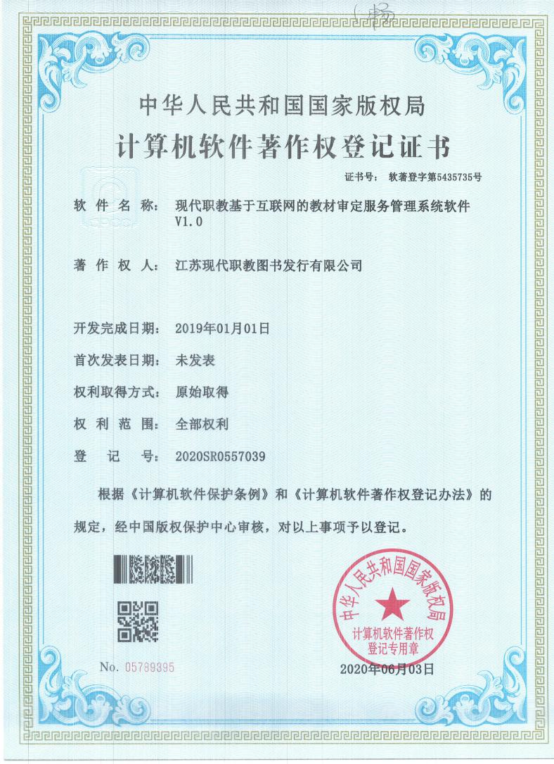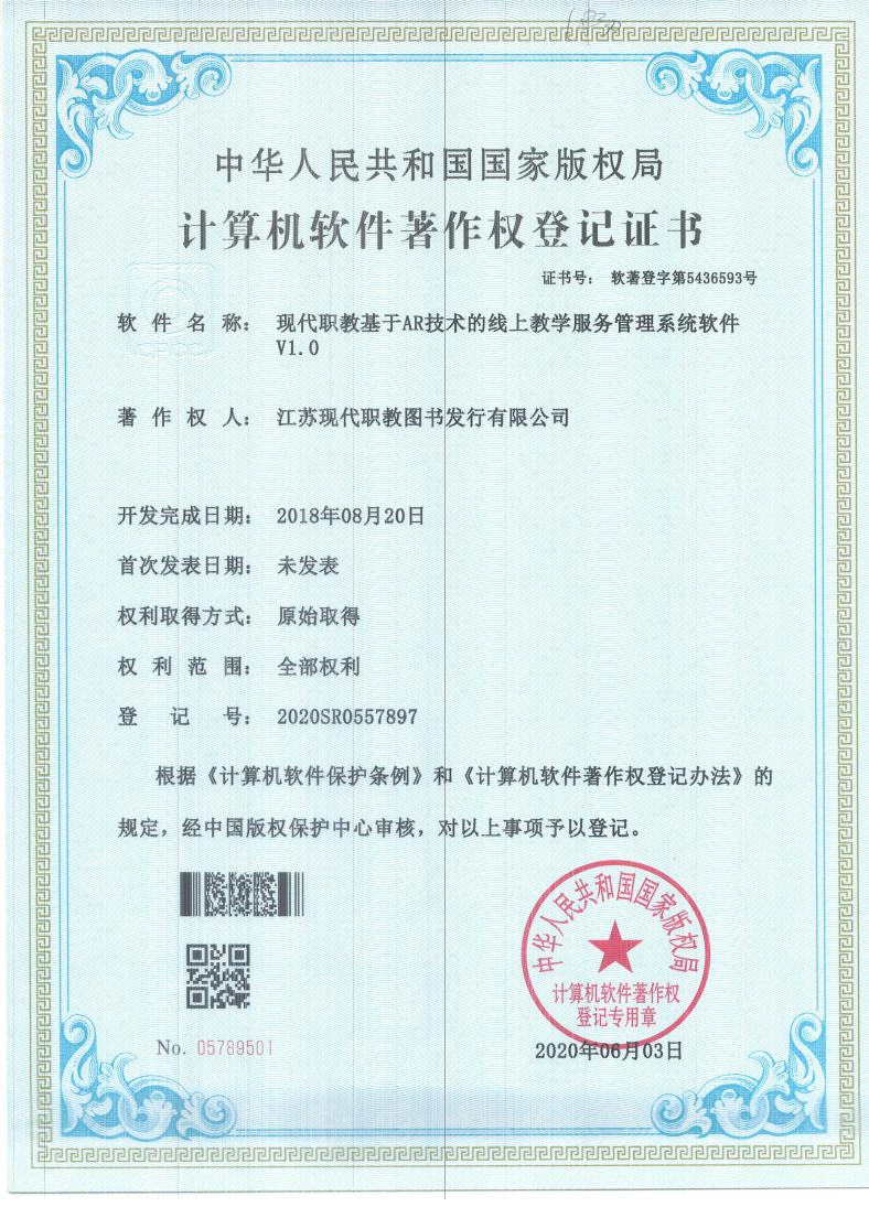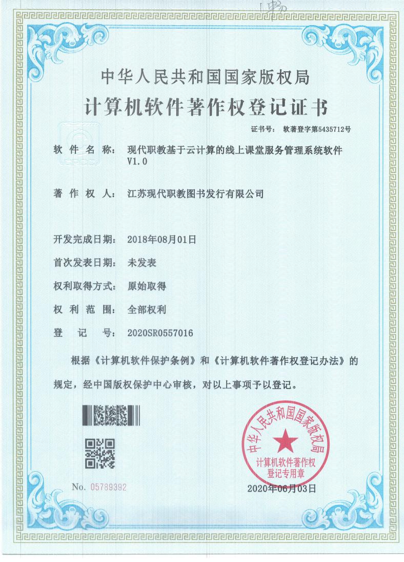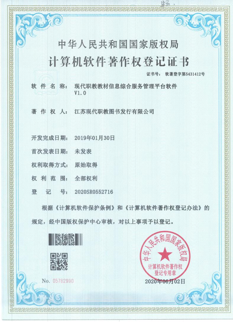2020年6月8日,公司历时三年研发完成的“现代云课堂”教学平台以及江苏职业教育教材管理信息服务平台,获得了国家版权局颁发的20项独家技术的计算机软件著作权授权。
