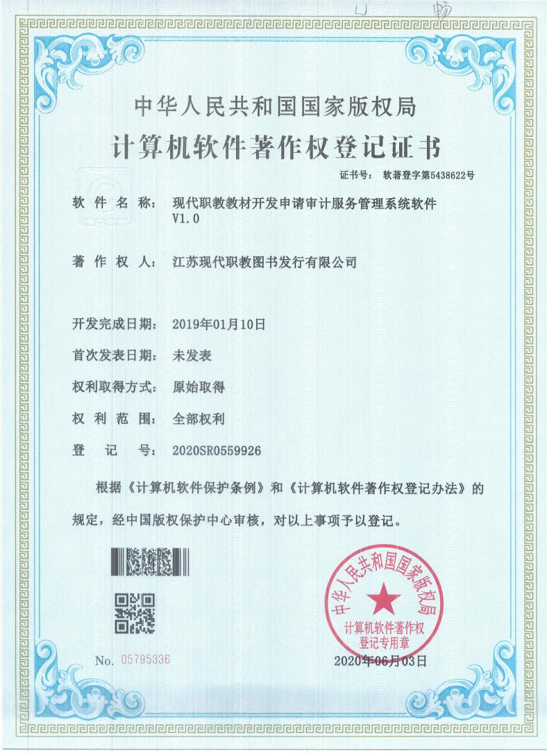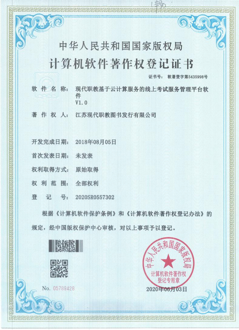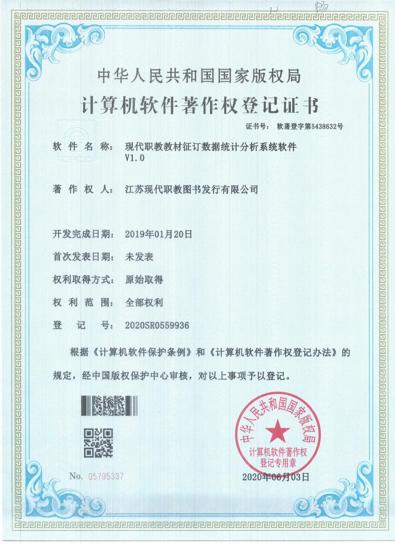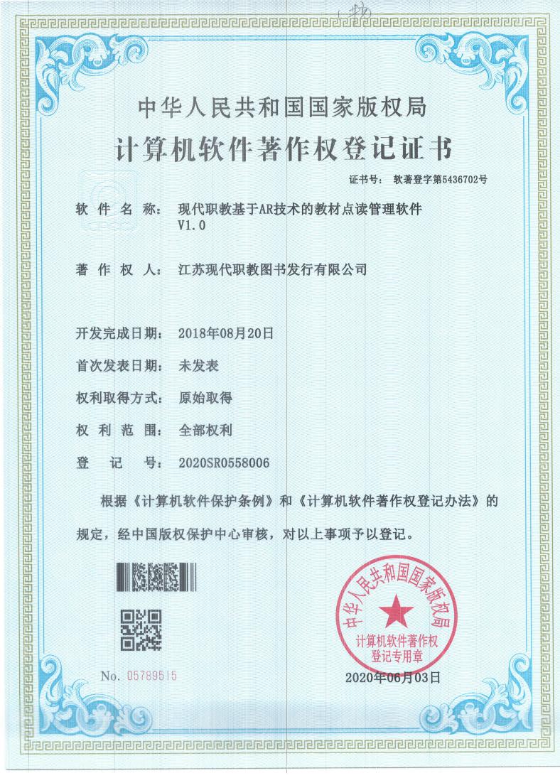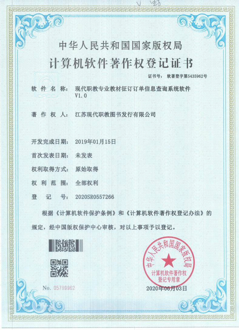 2020年6月8日,公司历时三年研发完成的“现代云课堂”教学平台以及江苏职业教育教材管理信息服务平台,获得了国家版权局颁发的20项独家技术的计算机软件著作权授权。