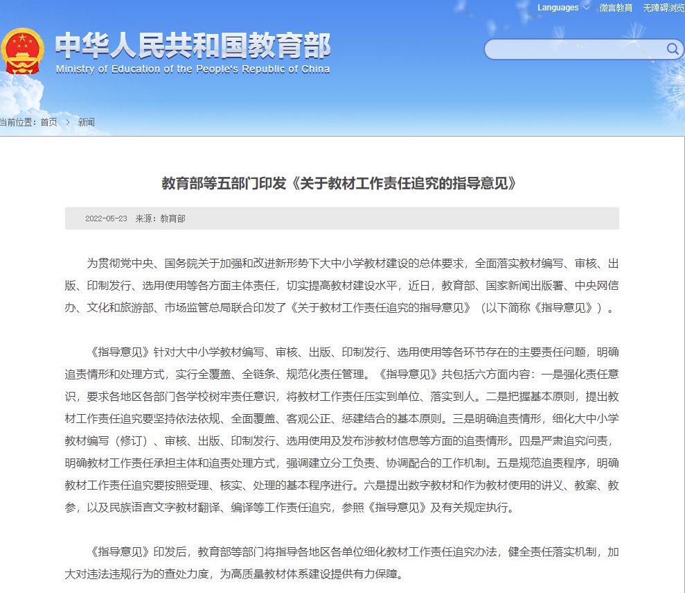 为贯彻党中央、国务院关于加强和改进新形势下大中小学教材建设的总体要求,全面落实教材编写、审核、出版、印制发行、选用使用等各方面主体责任,切实提高教材建设水平,近日,教育部、国家新闻出版署、中央网信办、文化和旅游部、市场监管总局联合印发了《关于教材工作责任追究的指导意见》(以下简称《指导意见》)。