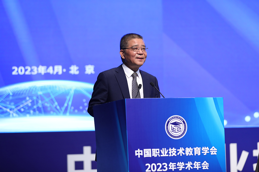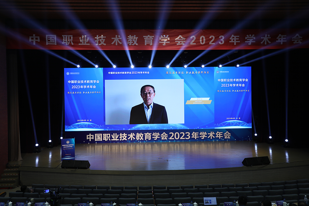 王定华在致辞中表示,党的二十大是我国经济社会发展和各项事业处在关键时期召开的一次具有重要现实意义和深远历史意义的盛会,再次明确了全党和全国各族人民在当前和未来一段时期举什么旗、走什么路,以什么样的精神状态,朝着什么样的发展目标胜利前进的重大问题。2023年是贯彻落实党的二十大精神的开局之年,也是实施“十四五”规划承上启下的关键一年。开局关系全局,起步决定后势。今天召开这次年会,聚集思想智慧,共享真知灼见,正当其时,恰逢其势。近年来,北京外国语大学及外研社与中国职业技术教育学会联系紧密,在职业外语教材出版、职教师资培训等方面不断发力,精心安排,为职业教育领域广大老师和同学提升外语水平,提高国际素养,扩展国际交流,持续做出北外人的贡献。今后,将把相关工作做得更好。
