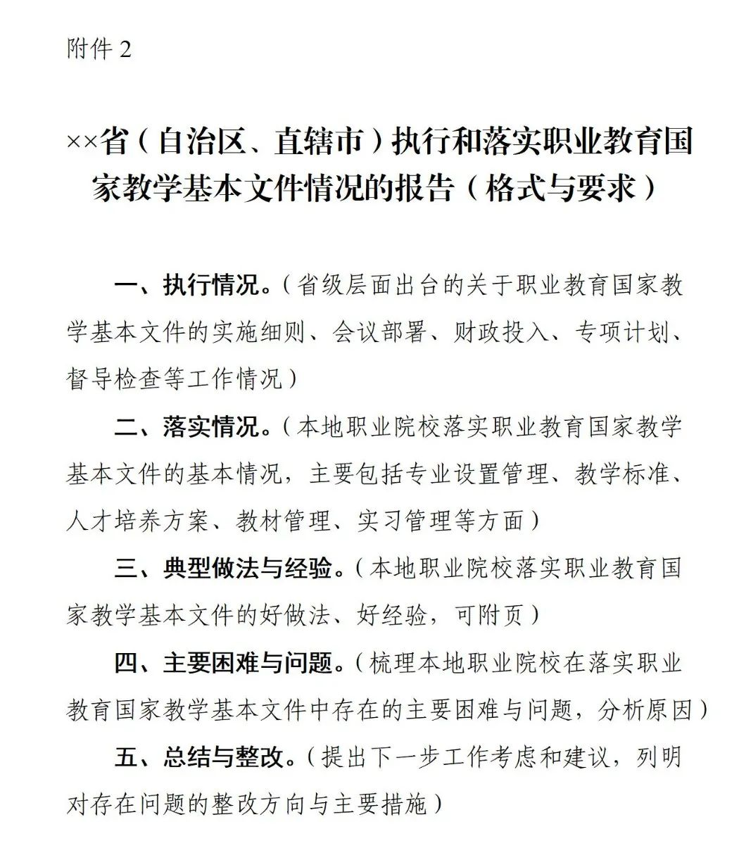 各地要认真组织本行政区域内职业院校对照现行国家教学基本文件清单(附件1)开展自查,全面梳理各项教学文件落实情况,并完成学校自查报告。各省级教育行政部门要组织抽查,并汇总各校自查报告,形成全省(自治区、直辖市)的情况报告(格式与要求见附件2)。