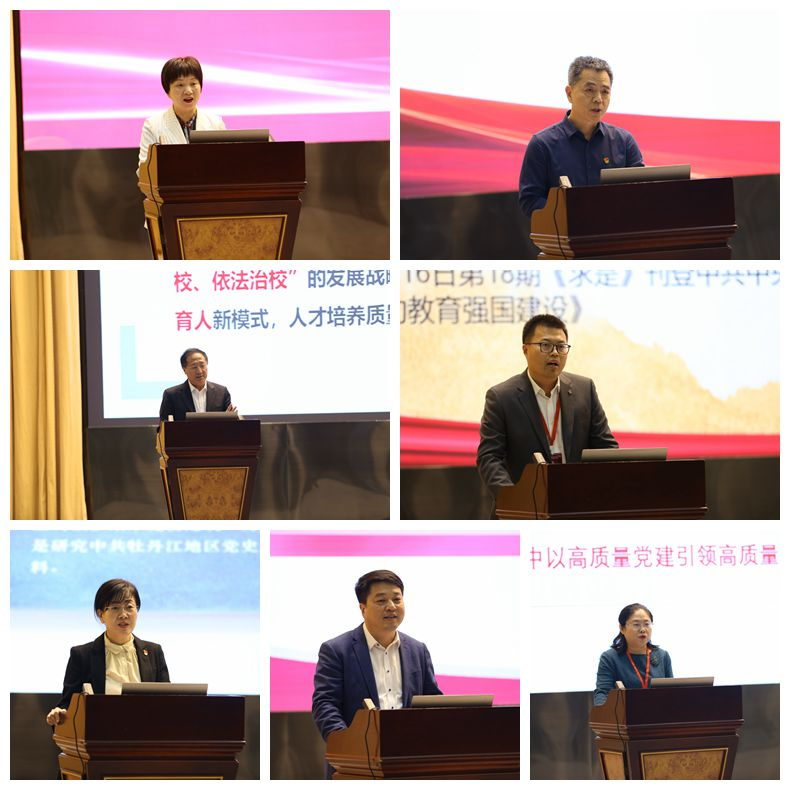 信阳航空职业学院党委书记杨春丽以《庚续红色血脉 创新育人模式 奋力谱写新时代航空职教新篇章》为题,沧州医学高等专科学校党委书记刘健以《党建引领,成果导向,融合发展—沧州医专党建与中心工作融合的思路与行动》为题,山东城市建设职业学院党委副书记高绍远以《党建引领、文化浸润、绿色低碳,推进职业教育高质量发展》为题,黄河水利职业技术学院党委副书记、校长胡昊以《党建引领 学思悟行,推动“新思想”铸魂育人见实效》为题,海林市职业教育中心党委书记于庆兰以《教育从心开始、铸魂情怀做根—“五心先锋”基层党建品牌创建典型工作案例》为题,浙江商业职业技术学院党委书记何瑶伟以《守正创新 善用善为 构建“大思政课”建设新样态》为题,北京市商业学校党委书记邢连欣以《筑牢党的领导根和魂,以高质量党建引领学校高质量发展》为题,分别作了大会交流发言。