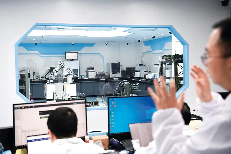 雄安创新研究院实验室主任王文亭(右)在进行科学实验