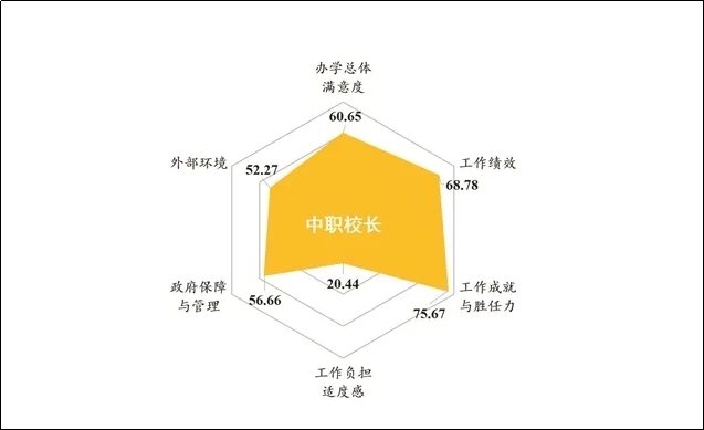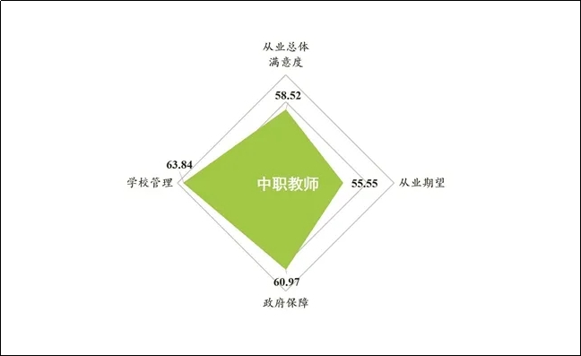 2019年,中职教师从业满意度得分为58.52分,和2016年相比,下降了3.91分,总体满意度高于职业期望,差值为2.97分。校长办学满意度得分为60.65分,校长总体满意度和内部满意度、外部满意度各维度得分自东部地区向西部地区梯度下降。