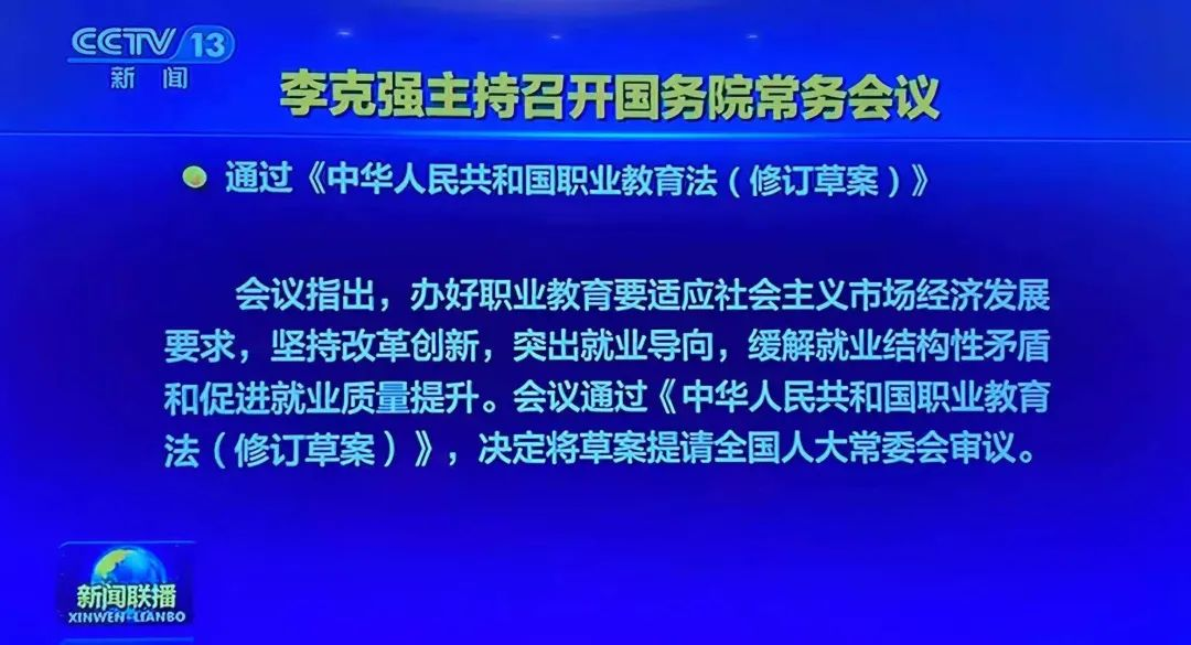 国务院常务通过《中华人民共和国职业教育法(修订草案)》