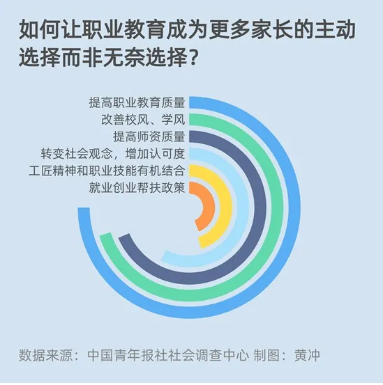 调查中,要让职业教育成为更多家长的主动选择而非无奈之举,62.6%的受访家长表示要提高职业教育质量,57.2%的受访家长认为要提高师资质量,58.5%的受访家长希望完善校园管理,改善校风、学风,48.3%的受访家长希望加大宣传,转变社会观念,增加认可度。